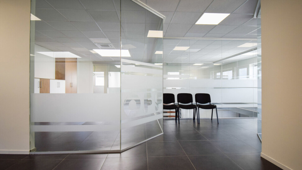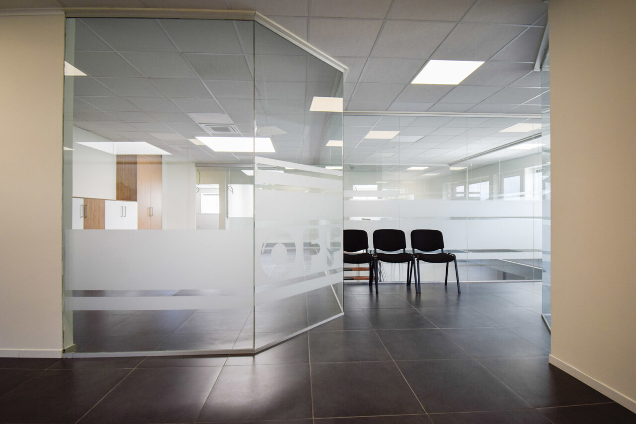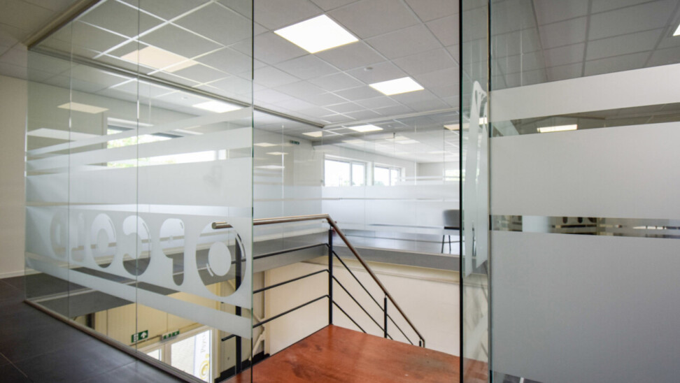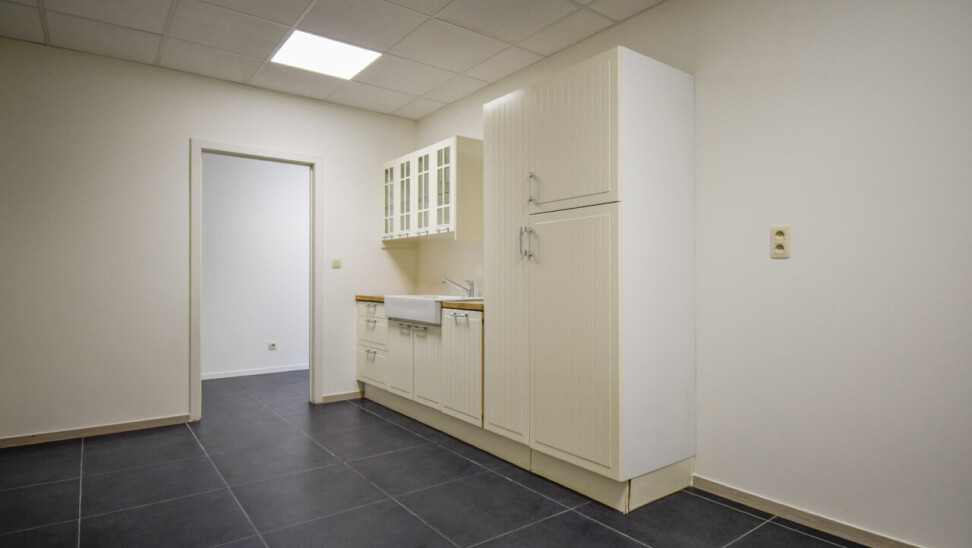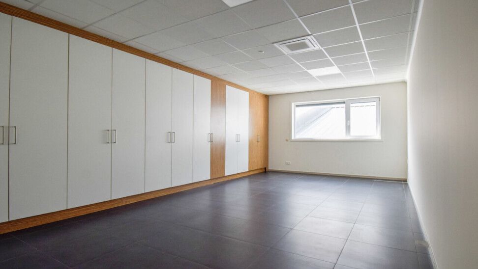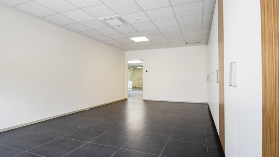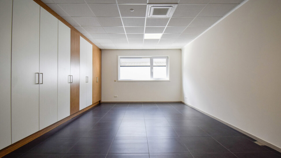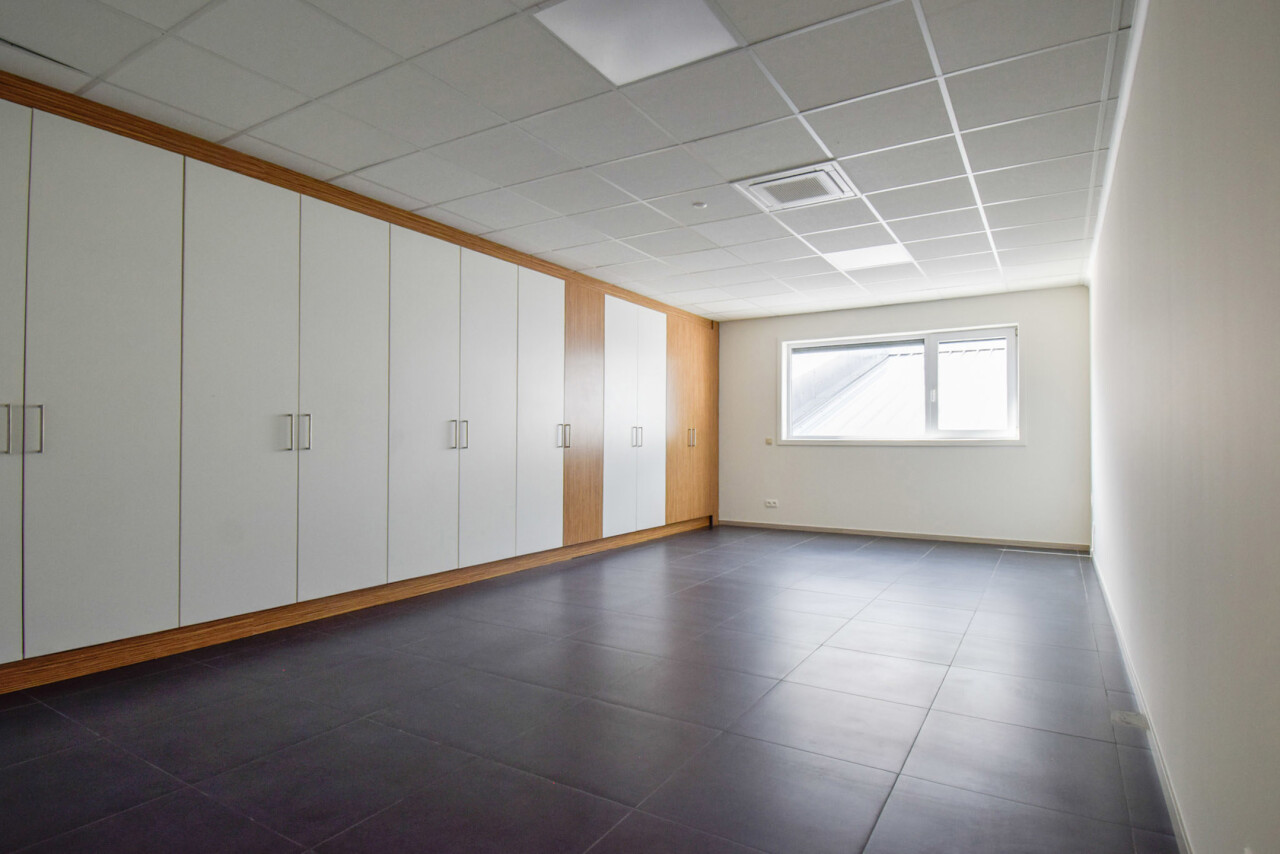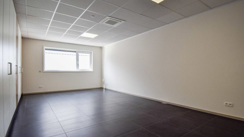 Het kantoor beschikt over een open ruimte met veel natuurlijk daglicht dankzij grote ramen. Een gemeenschappelijke inkom met wachtzaal geeft een professionele indruk aan bezoekers. Privékantoren en een opslagruimte of werkplaats zijn optioneel bij te huren op dezelfde site.