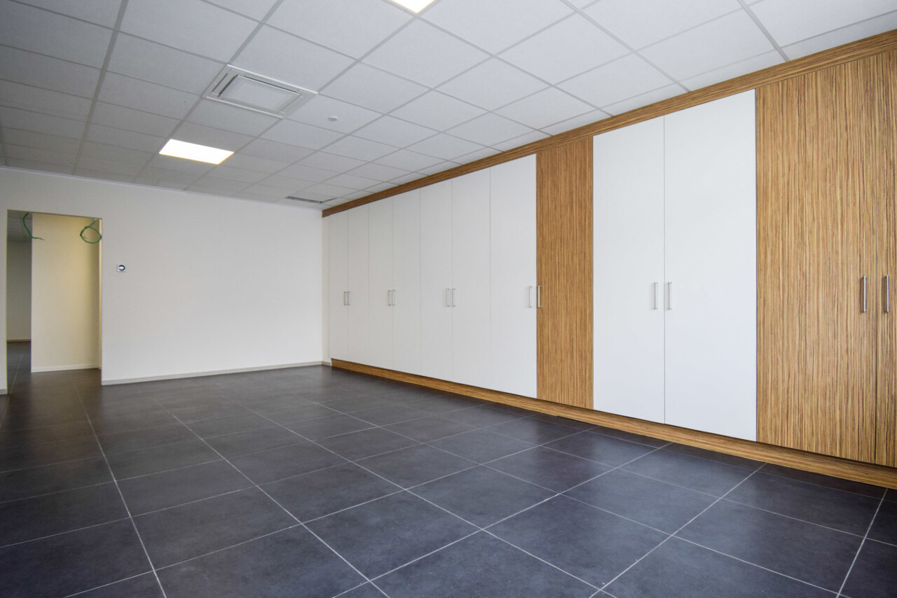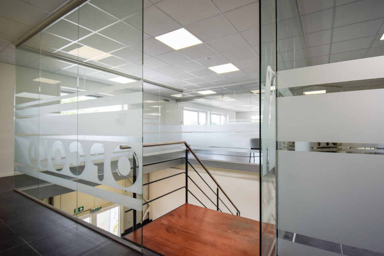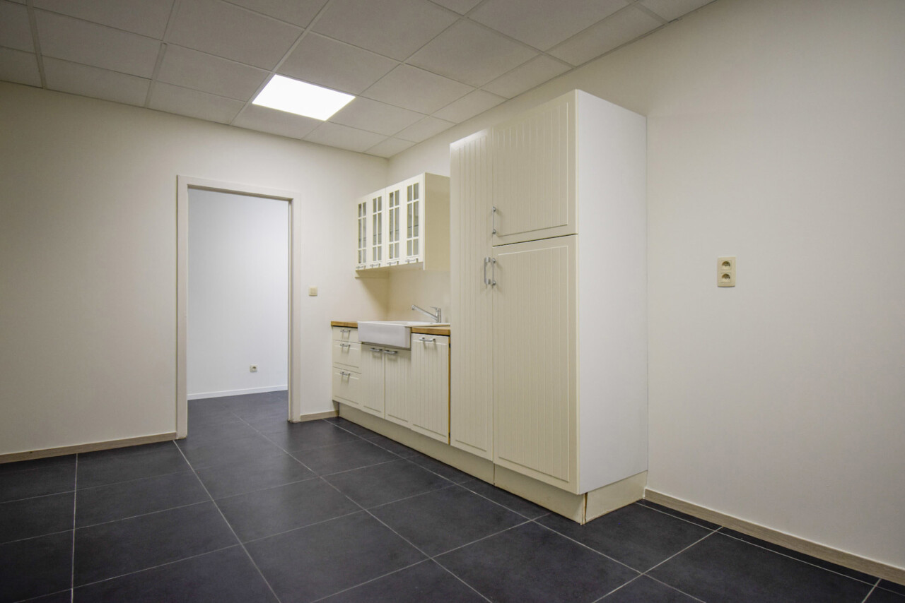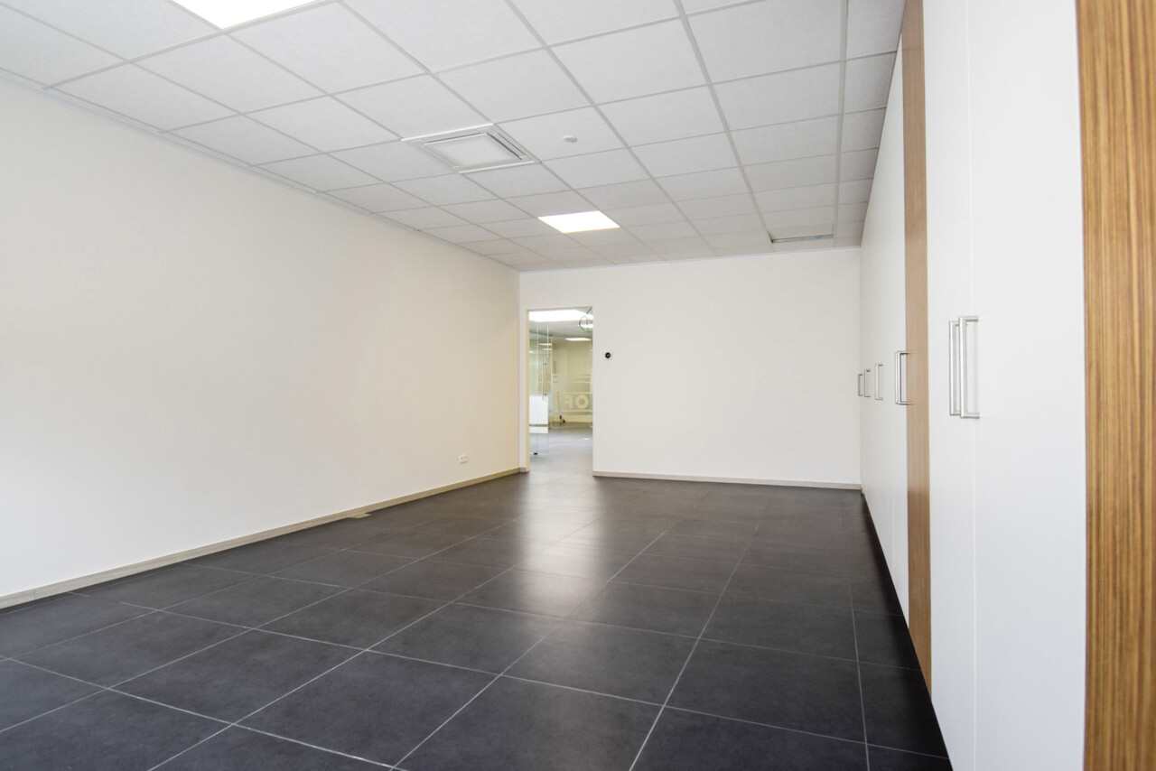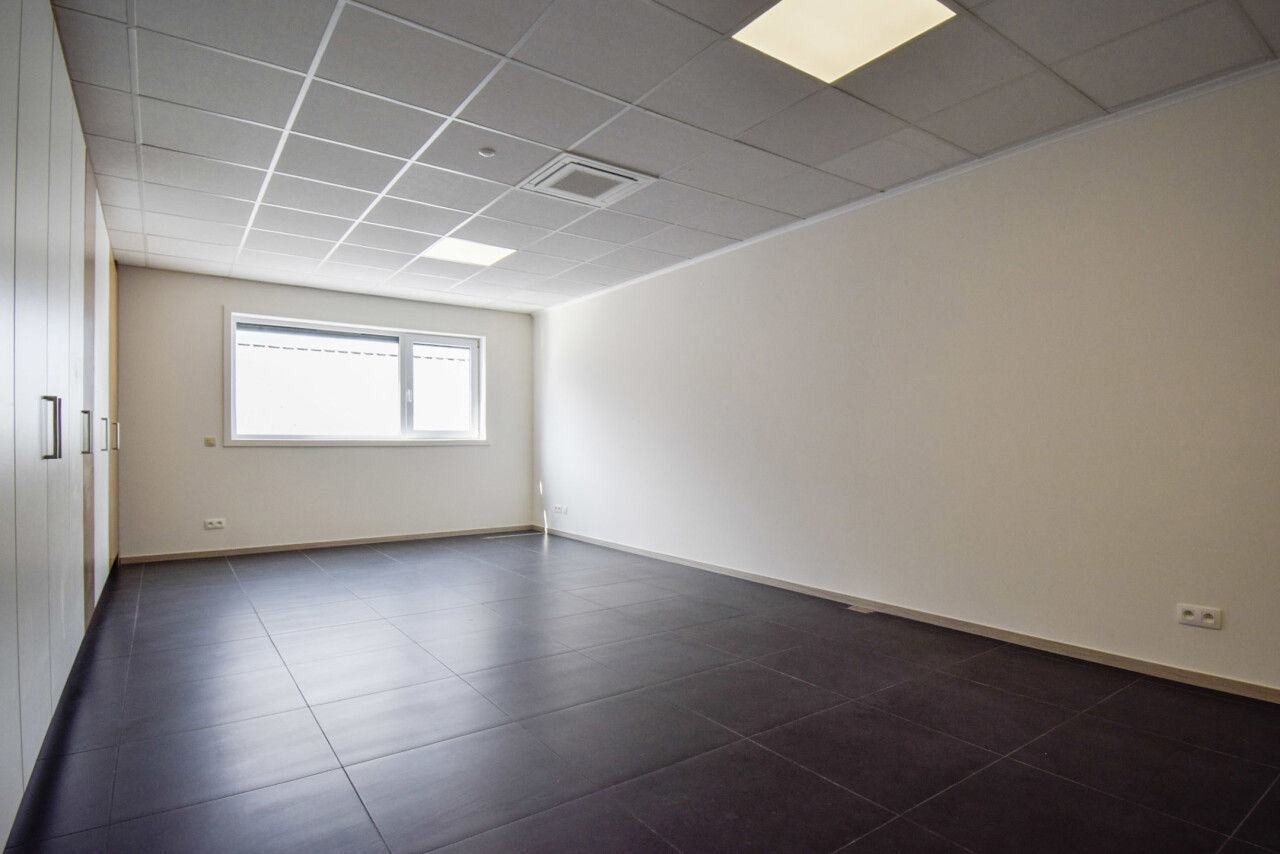 Het kantoor beschikt over een open ruimte met veel natuurlijk daglicht dankzij grote ramen. Een gemeenschappelijke inkom met wachtzaal geeft een professionele indruk aan bezoekers. Privékantoren en een opslagruimte of werkplaats zijn optioneel bij te huren op dezelfde site.